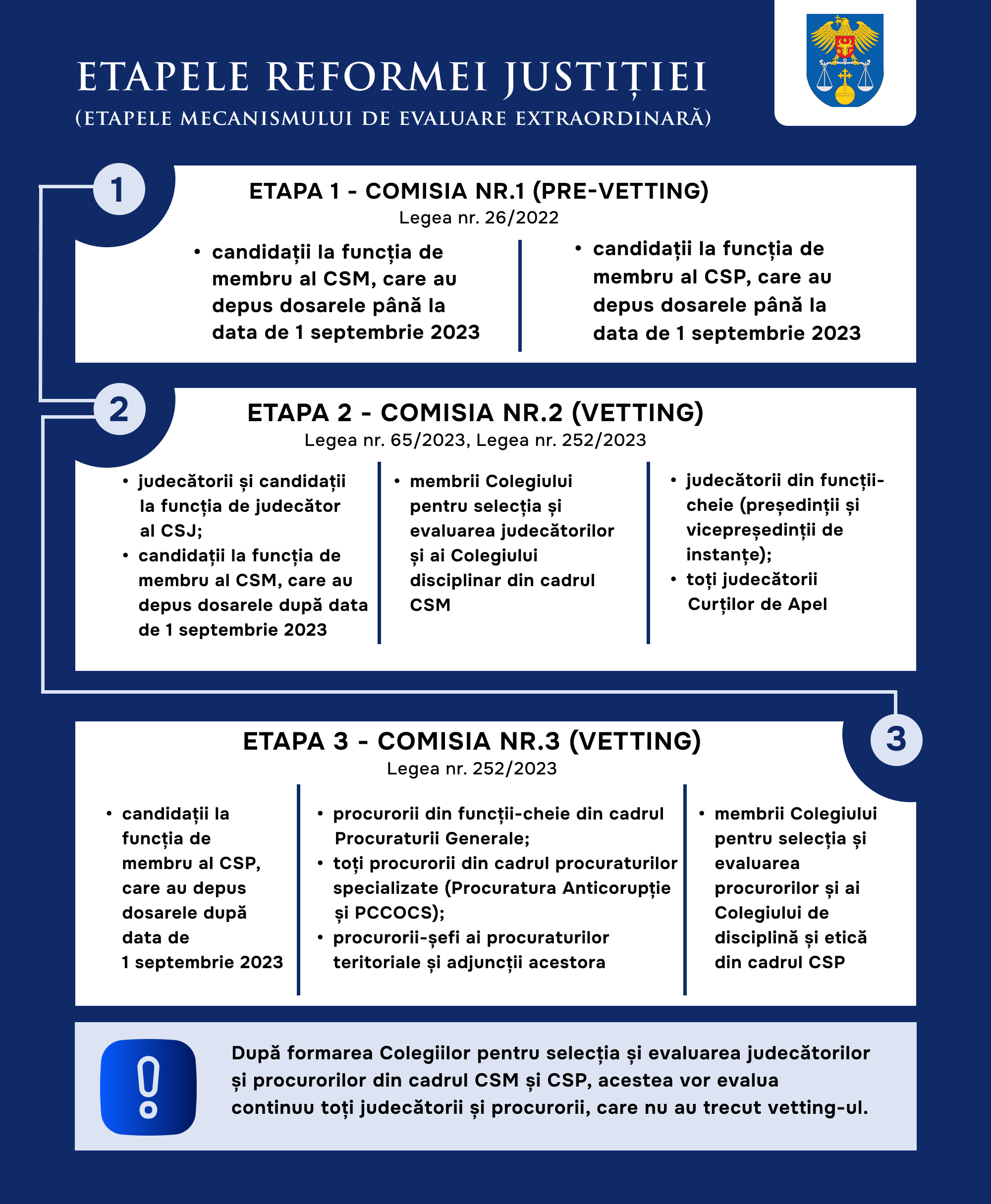 27 noiembrie 2023, Chișinău - Astăzi, Comisia nr.2 (Comisia vetting) începe audierea judecătorilor Curții Supreme de Justiție (CSJ) și a candidaților la funcția de judecător al CSJ. În acest context, pentru informare și claritate, prezentăm un rezumat al etapelor mecanismului de evaluare extraordinară: ce s-a făcut, unde suntem și ce urmează.