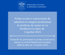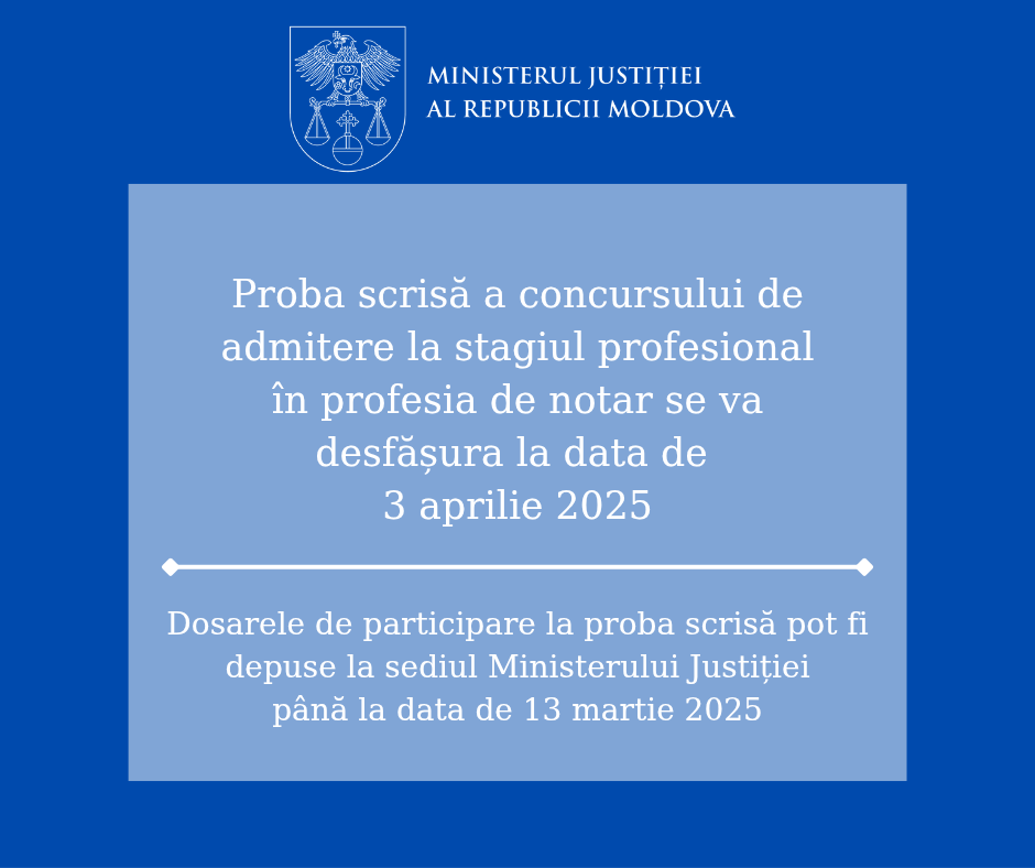 25 februarie 2025, Chișinău - Comisia de licențiere a activității notariale a decis, prin Hotărârea nr. 2 din 21.02.2025, că proba scrisă a concursului de admitere la stagiul profesional în profesia de notar se va desfășura la data de 03 aprilie 2025. Persoanele interesate pot depune dosarele de participare la proba scrisă până la data de 13 martie 2025 inclusiv, la secretariatul Ministerului Justiției (str. 31 august 1989, 82 mun. Chișinău, bir. 128).